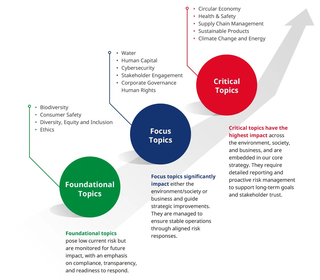 Nine material topics were identified and prioritized in terms of impact materiality and financial materiality on society, the environment, and the Company’s value. They were endorsed by the SRMC for sustainability disclosure as follow: